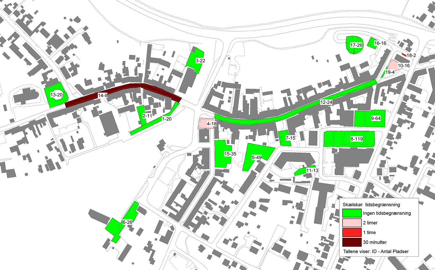 Parkeringspladser i Skælskør fordelt på tidsrestriktioner. Der er ikke foretaget detaljeret registrering af belægningen.