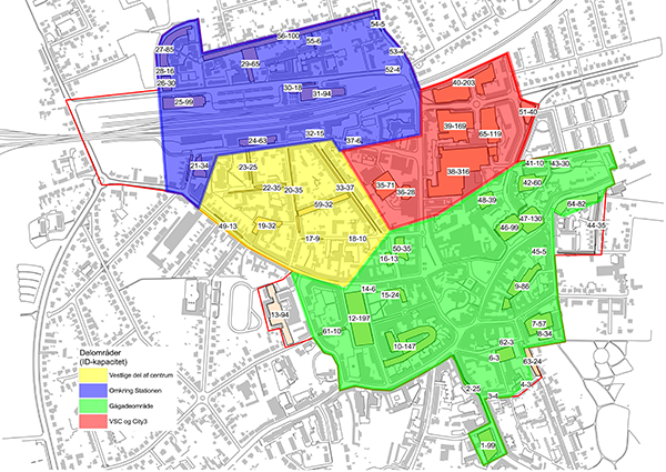 På den baggrund er Slagelse inddelt i fire sammenhængende delområder, hvor det vurderes at parkeringen i hovedtræk har samme formål, og parkeringspladserne inden for de enkelte områder kan fungere som alternativer for hinanden. De fire områder er: Et område omkring stationen, centerområdet omkring Vestsjællandscenteret og City3, området omkring gågaderne, samt den vestlige del af centrum.